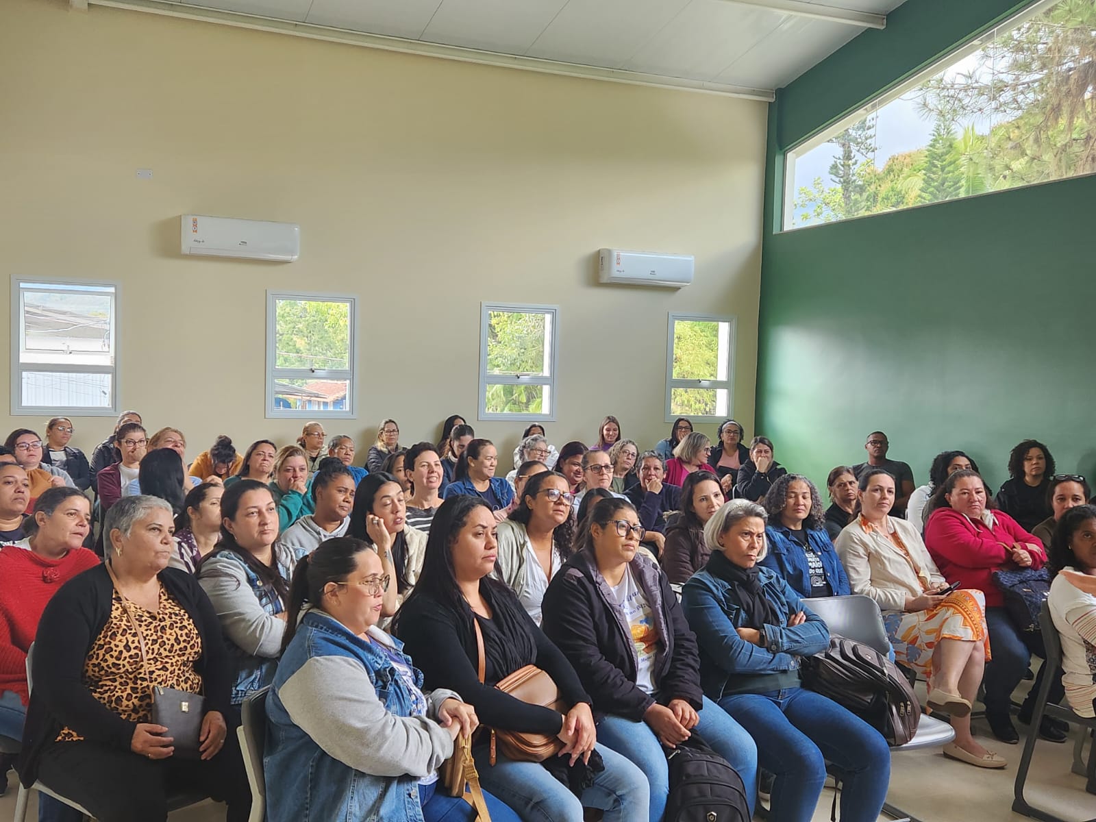 Estavam presentes agentes de alimentação escolar, merendeiras, auxiliar de serviços gerais e profissionais do Programa SOS das equipes de alimentação que atuam no Ensino Infantil e nos anos finais do Fundamental.