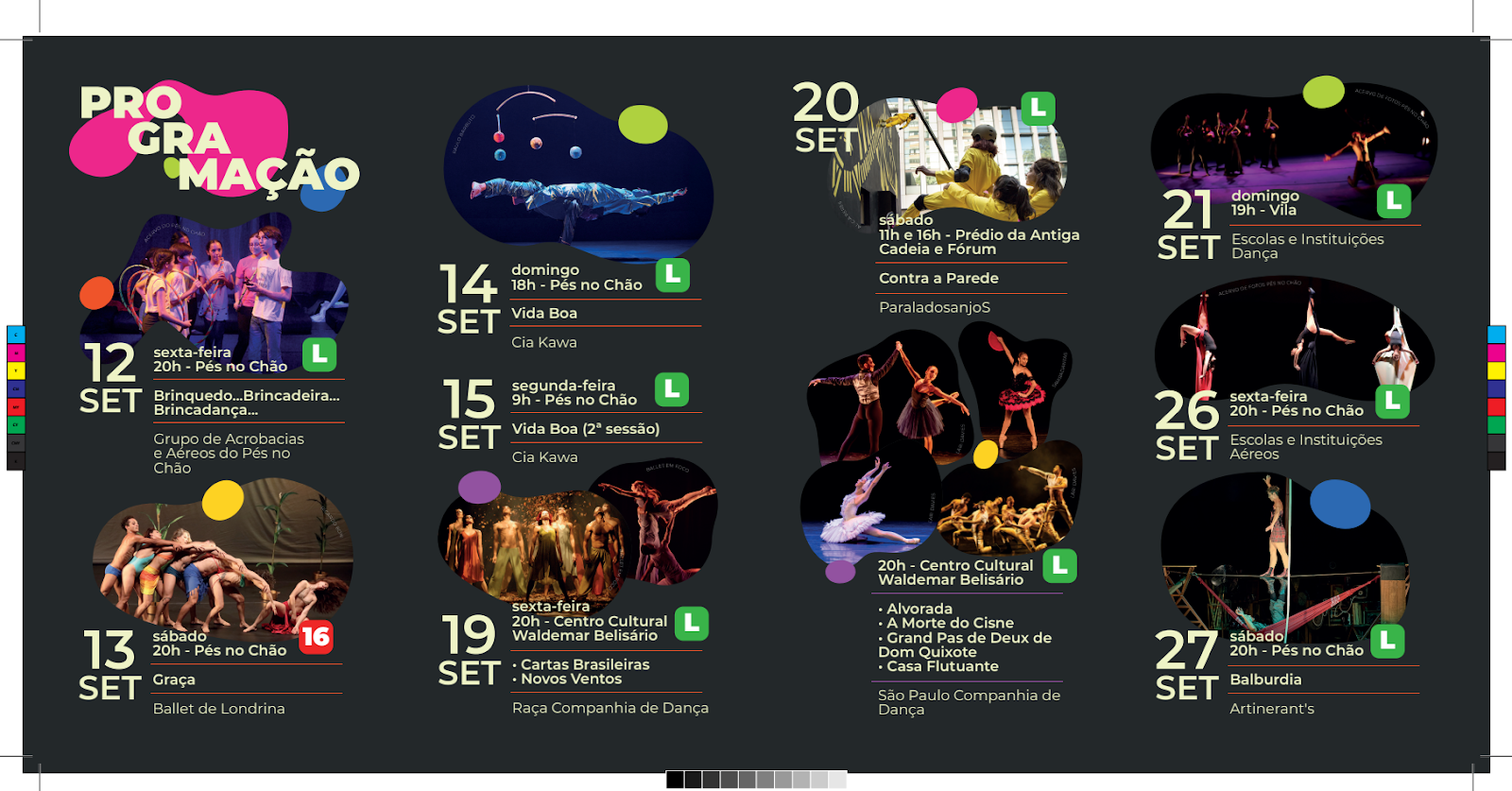 O primeiro final de semana, na 6ª feira, 12 de setembro (às 20h), abre com um espetáculo da casa. “Brindadeira… Brinquedo… Brincadança…” é uma obra produzida pelo “Grupo de Acrobacias e Aéreos do Pés no Chão”, dirigida pela arte-educadora Juliana Andrade. Com 75 crianças no palco usando as linguagens da acrobacia, dos aéreos, da dança e do teatro, a peça resgata as diversas formas do brincar, como esconde-esconde, pega-pega, bambolê e pular corda, para questionar o uso excessivo do celular durante a infância.