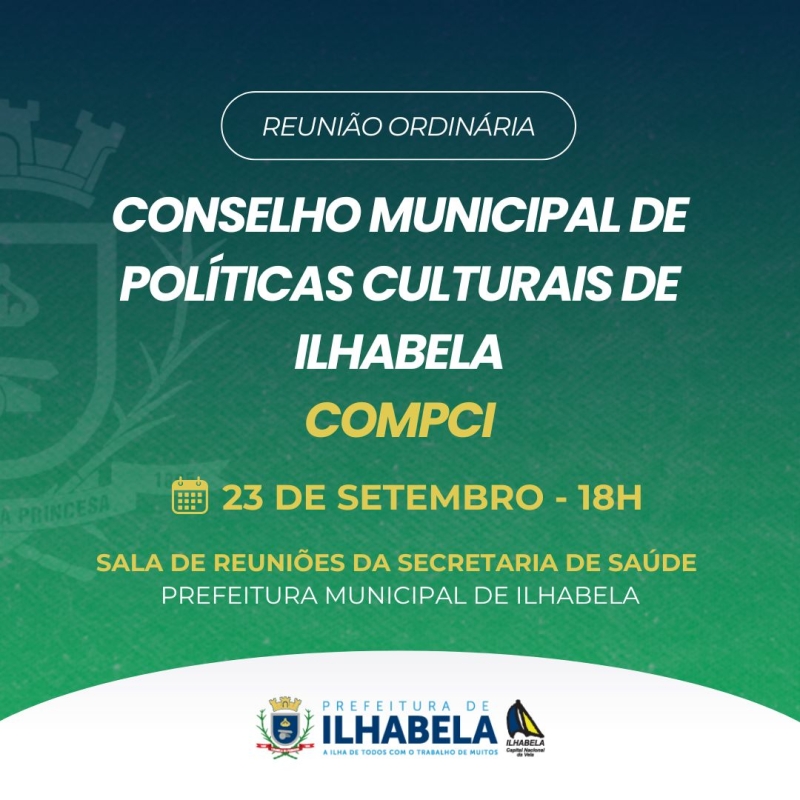 O Conselho Municipal de Políticas Culturais de Ilhabela (COMPCI) realiza reunião ordinária nesta terça-feira (23), às 18h, em modelo híbrido. De forma presencial, o encontro será na sala de reuniões da Secretaria de Saúde, localizada no Paço Municipal, na Rua Prefeito Mariano Procópio de Araújo Carvalho, nº 86 – Perequê.