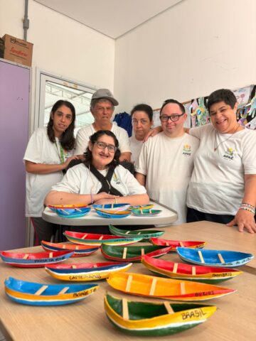 A etapa final contou com o apoio da instrutora de artesanato Regina Libarino e da monitora Gabriela Moura, experiente em pintura de canoas caiçaras. A presença de ambas garantiu a adaptação de cada pintura e a finalização das peças, de modo que todos os atendidos completaram a atividade, independentemente de qualquer limitação física ou cognitiva. O resultado foi um conjunto de trabalhos que expressa a criatividade e as referências culturais presentes no dia a dia de cada um.